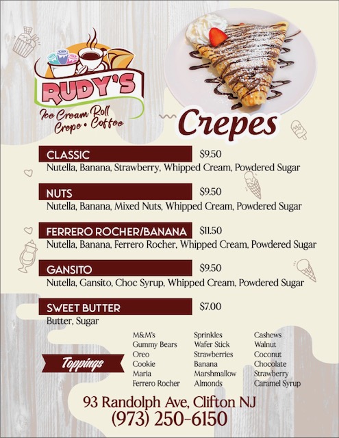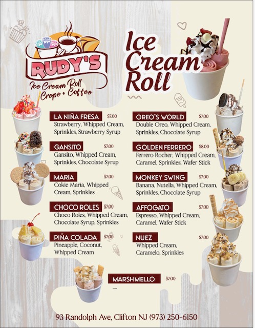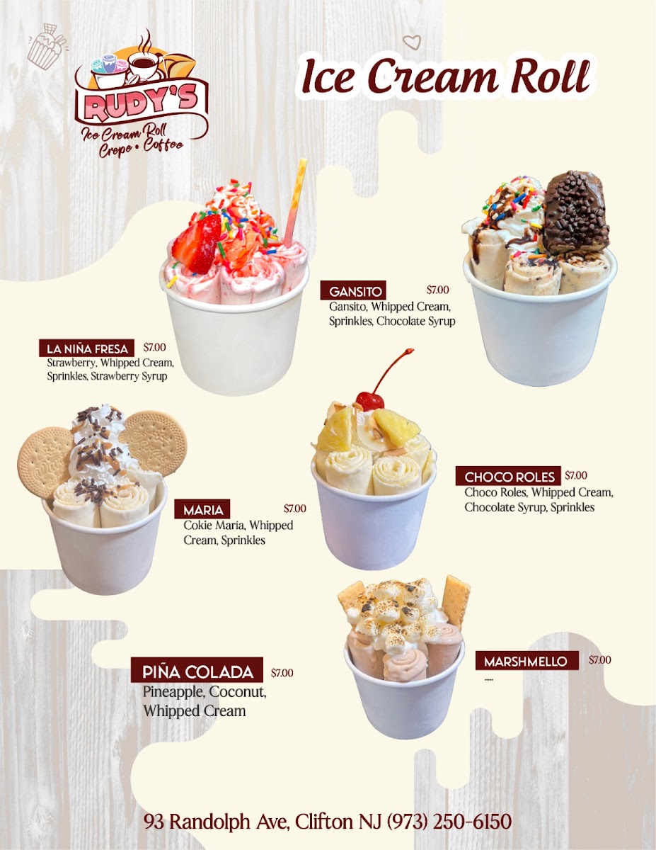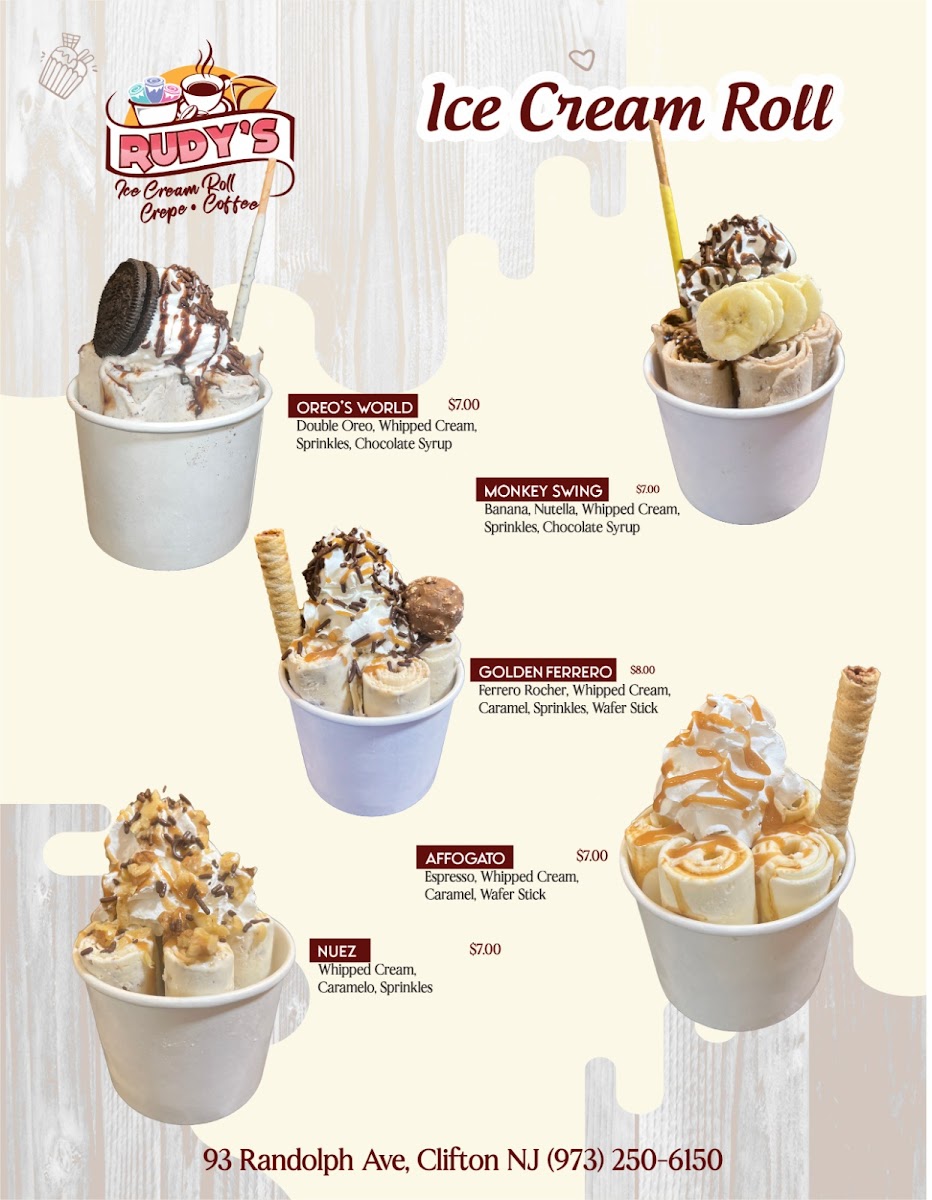 The menu at Rudy's offers a variety of dessert and light meal options suitable for coffee breaks, casual dining, or a sweet treat. The menu is structured into distinct categories that include rolled ice cream, crepes, and specialty beverages.